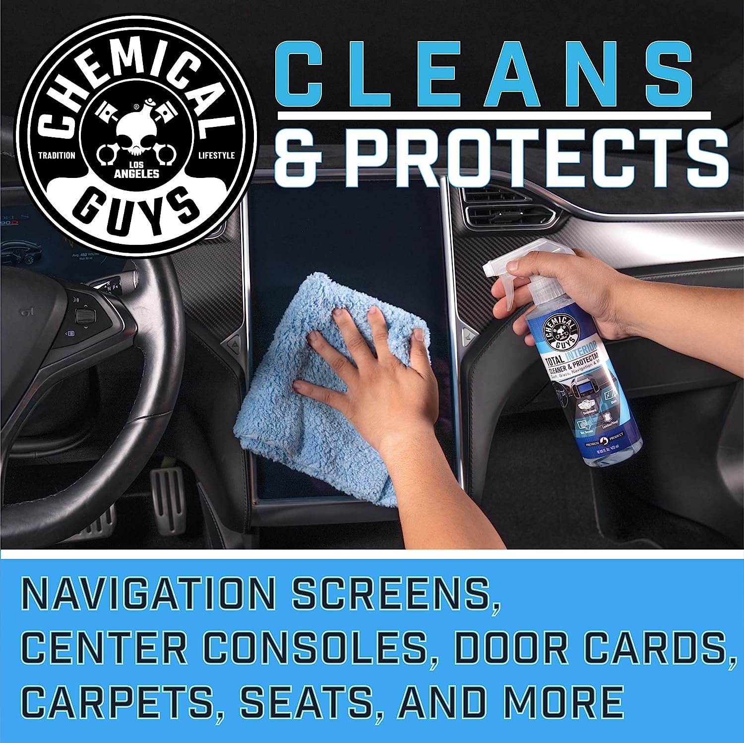 - ONE CLEANER TO RULE THEM ALL – Rather than use separate cleaners for leather, vinyl, plastic, carpet, cloth, glass, and wood, Chemical Guys developed Total Interior Cleaner & Protectant; with just one product, you can now clean and protect virtually all interior surfaces!